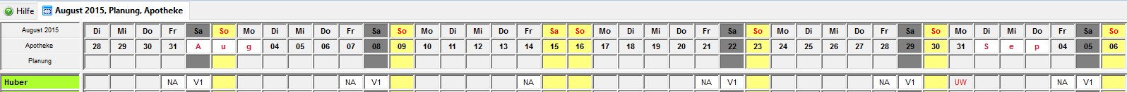 Neben den beiden Lupen finden sich zusätzlich noch zwei Werkzeuge, mit denen man die Breite der einzelnen Tagesspalten des Monatsplan anpassen kann. Das Symbol mit dem „blauen Rechteck mit dem grünen Pfeil“ macht die Spalten breiter, wo hingegen das Symbol mit dem „blauen Rechteck und dem roten Pfeil“ die Spalten wieder schmaler macht.
