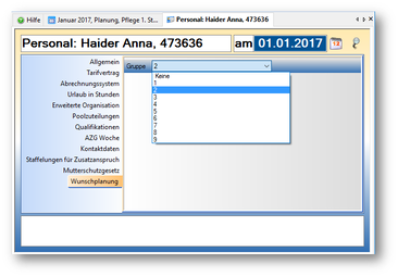 Jene Mitarbeiter, die an der Wunschplanung teilnehmen dürfen, müssen einer Gruppe zugeordnet werden. Anhand dieser Gruppe wird später definiert, zu welchem Zeitpunkt die Wunschplanung durchgeführt werden darf. Die Gruppe ist direkt im Personalstamm der Mitarbeiter zu hinterlegen. Jene Gruppe, die im aktuellen Monat als erste an der Reihe war, rutscht im nächsten Monat an die letzte Stelle, alle anderen Gruppen rücken um eine Position nach vor.