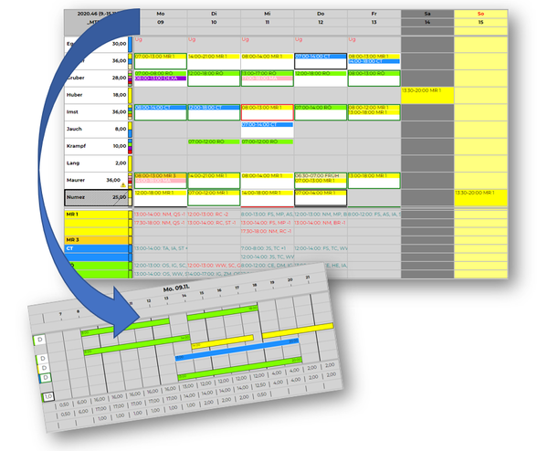 - Aufgabenplanung in Radiologiezentren : Mitarbeiter arbeiten entweder im CT, MR, Röntgen oder in der Verwaltung. PLUS: Berücksichtigung der Qualifikation der Mitarbeiter.