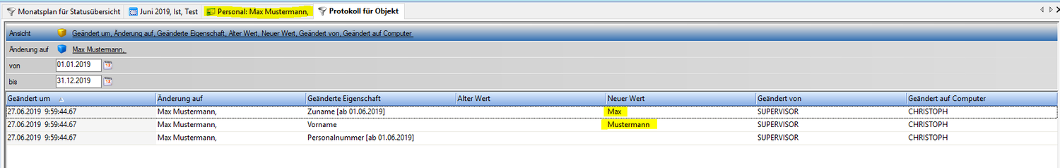 | Änderung bei Max Mustermann am 27.06.2019 durch den Benutzer SUPERVISOR: Zuname und Vorname |
