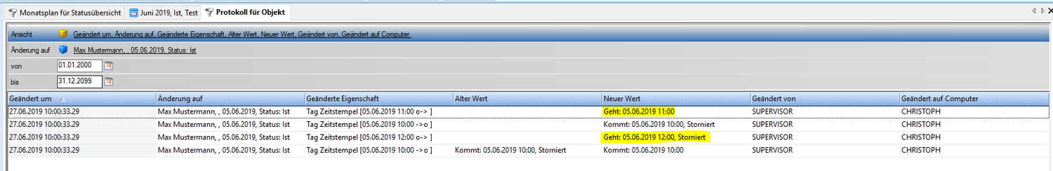| Zeitstempel wurde für den 05.06.2019 am 27.06.2019 bei Herrn Max Mustermann vom Benutzer SUPERVISOR von 12:00 Geht auf 11:00 Geht geändert. |