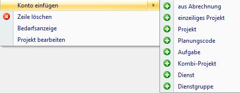 Mit einem Rechtsklick gelangt man in das Menü des Besetzungsreports. Hier gibt es die Kategorie "Konto einfügen". Darunter gibt es dann die verschiedenen Konto-Basis:
