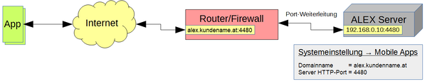 ALEX-APP auf Smartphone - < Internet > - < Firewall/Router > - < LAN > - ALEX-Dienst am Server