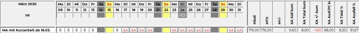 Am 16.03. werden 8 Stunden geleistet und danach ist der Mitarbeiter "Abwesend Kurzarbeit". Im normalen Monat ist er +/-0.