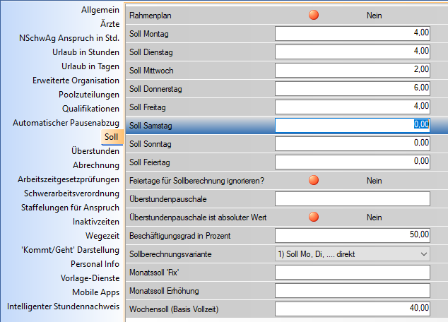 Hier kann hinterlegt werden, welche Stunden für Wochenfehler anrechenbar sind. Diese Stunden werden in Alex unter dem Begriff "gesammelte Zeit" verwaltet.