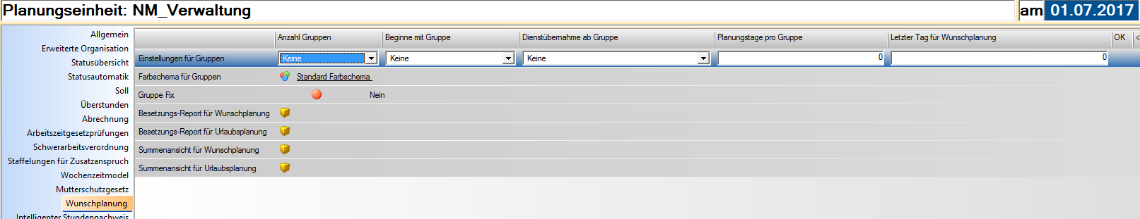 Einstellung: Die Gruppe muss im Personalstamm per Stichtag ab jenem Datum hinterlegt werden, ab welchem der Benutzer erstmalig einsteigen möchte. (wenn zB die Wunschplanung mit dem Septemberplan startet, muss bereits ab ca. Juni/Juli die Gruppe bei den Mitarbeitern hinterlegt sein).