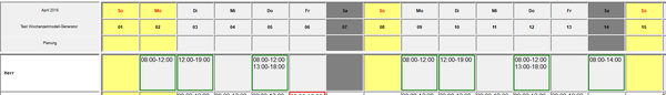 Herr Test arbeitet jeden Montag 8-12, Dienstag 12 - 19 und Donnerstag 8-12/13-18 sowie jeden 2. Samstag 8 - 14: