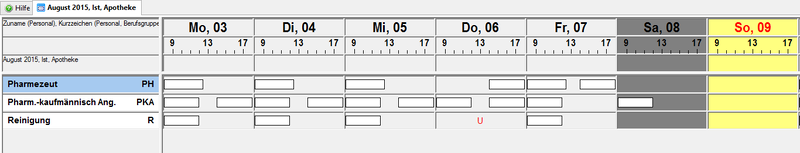 Es ist möglich sich die Dienste im Monatsplan als Zeitleiste anzeigen zu lassen. Die Zeitleiste kann in der Werkzeugleiste unter "Darstellung" eingeblendet werden.