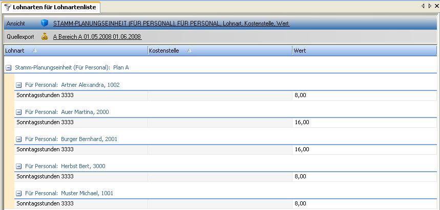 Diese Informationen, Zeitkonten und Lohnarten, können auch mittels Lohnartenliste für ausgewählte Ressourcen abgefragt werden.