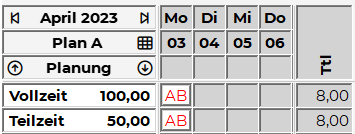 Die im Schema definierte Ausfallberechnung kommt dann zu tragen, wenn am Tag kein Dienst oder Zeitstrecke hinterlegt ist und ein Tages-Planungscode eingetragen wird.