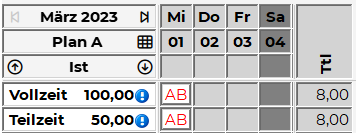 Wird bei einer Schemaspezifikation B) Soll hinterlegt, so steht das angelegte Schema sowohl im Status Planung als auch im Status Ist im direkten Zusammenhang mit den berechneten Sollstunden des Mitarbeiters für diesen Tag.