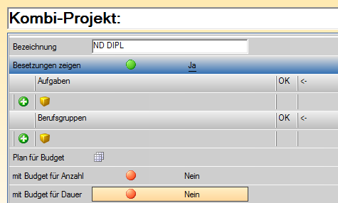- Aufgaben: Hier müssen alle Dienste, welche im Kombi-Projekt angezeigt werden sollen, hinterlegt werden. Diese können auch von unterschiedlichen Planungseinheiten kommen. (z.B. ein Kombiprojekt über alle Nachtdienste im Haus - wer ist in der Nacht im Dienst?)