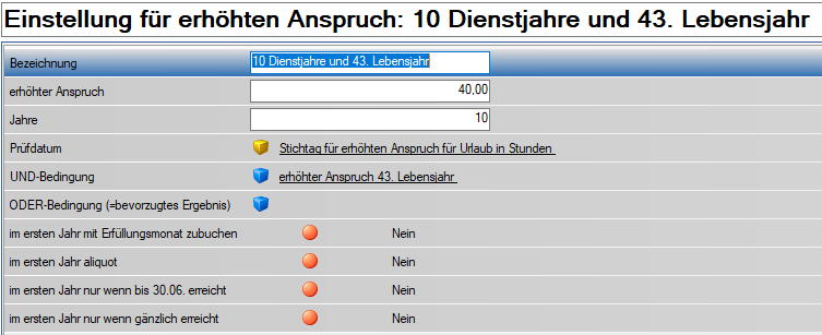 ODER-Bedingung (=bevorzugtes Ergebnis): Gibt es eine weitere unabhängige Bedingung, die den erhöhten Anspruch auslöst, kann diese hier zusätzlich angelegt werden. Ist eine der beiden Bedingungen erfüllt, so wird der erhöhte Anspruch, der bei diesem Punkt hinterlegt ist, verwendet. (wichtig, wenn der erhöhte Anspruch der beiden Bedingungen unterschiedlich ist)