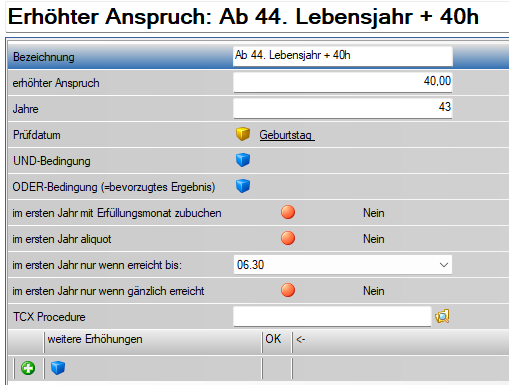 UND-Bedingung: Muss eine weitere Bedingung für den erhöhten Anspruch erfüllt werden, muss diese zusätzlich angelegt werden und hier anschließend verknüpft werden.