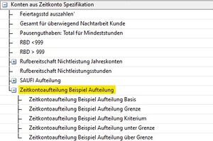 Zeitkonto Spezifikationen sind Steuerdaten um kundenspezifische Berechnungen zu definieren. Diese sind in der Zeitkontogruppe Konten aus Zeitkontosammlung/Spezifikation verfügbar.