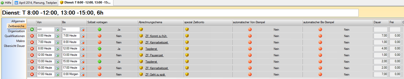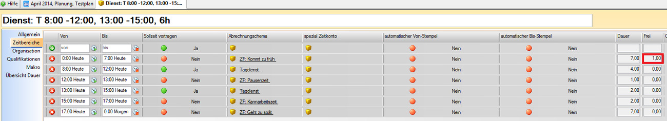 Rechts im Feld wird nun unter "Dauer" die Dienstdauer des einzelnen Zeitbereichs angezeigt.