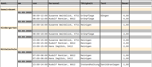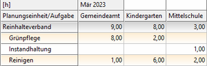 Diese Organisatitionsform wird verwendet, wenn die Kostenstellen vom gleichen Typ sind. (Z.B.: alle Kostenstellen sind 'Gemeinden', 'Gebäude', 'Produktionsbänder', 'Apotheken', etc.). Hier können verschiedene "Arten der Tätigkeit" (=Aufgabe, z.B.:"Reinigen", Instandhaltung", ""Grünpflege") auf unterschiedlichen Kostenstellen (Z.B.:"Mittelschule", "Gemeindeamt", "Kindergarten") erbracht werden. Das spiegelt sich im Screenshot Ergebnis im Konto-Report wider, da die Aufgabe "Reinigen" bei den Kostenstellen "Gemeindeamt", "Kindergarten" und "Mittelschule" ersichtlich ist.