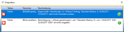 - Der Mitarbeiter beantragt eine Überstunde. Wird diese genehmigt, so entsteht ein Tagesfehler. Dieser müsste dann nochmals vom Bearbeiter händisch mit einem anderen Planungscode hinterlegt werden.
