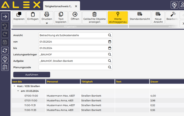 Der Tätigkeitsnachweis ist eine Anzeigefunktion, die je Kostenstelle geleistetete Arbeitszeit darstellt.