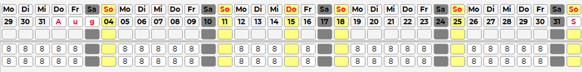 Sind Dienstgruppen in den Diensten hinterlegt, so könnte in der 3. Kalenderzeile immer die Anzahl pro Dienstgruppe und nicht pro Dienst angezeigt werden.