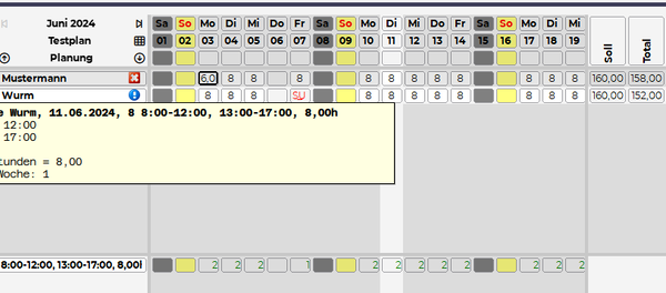 Ist der Parameter auf NEIN eingestellt, so wird das Tooltip bei den Summen im Dienstplan nur bei den Überschriften angezeigt.
