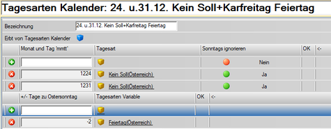 Unter "Tagesarten Standard" beim Parameter "Tagesarten Kalender" können wiederkehrende Tage angelegt werden, die nicht unter gesetzliche Feiertage fallen, jedoch trotzdem eine besondere Sollberechnung haben.