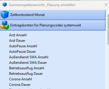 In der Summenspaltenansicht gibt es "Planungscode Auswerten". Hier wird für jeden Planungscode ein Konto für die Anzahl und die Dauer bereitgestellt.