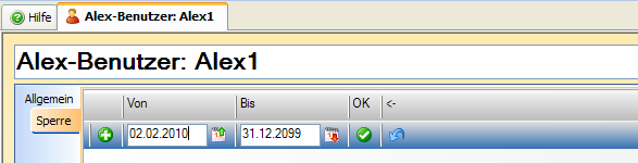 Ein Benutzer kann für einen bestimmten Zeitbereich gesperrt werden. Um einen Benutzer für einen Zeitbereich zu sperren, muss in der Gruppe "Sperre" eine neue Zeile mit dem gewünschten Zeitbereich angelegt werden und mit dem grünen Häckchen bestätigt werden.