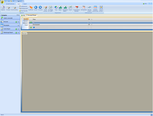 Die angelegten Reports können über „Suche Report für Suchbegriff“ abgerufen werden. Es sind die Planungseinheit oder Mitarbeiter und der Zeitbereich für die Auswertung einzustellen.