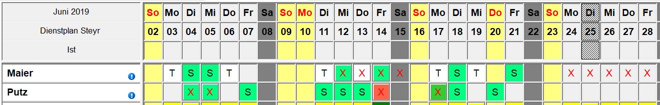Ab der Verison 2019.14 werden eingetragene Planungscodes, für Benutzer mit dem Recht " DIENSTPLAN LESEN (EINGESCHRÄNKT) " anonymisiert. Das bedeutet, alle Abwesenheiten werden mit einem X gekennzeichnet.