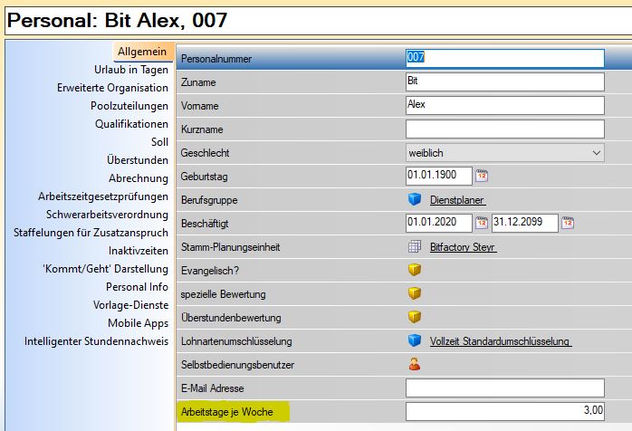Pro Personal kann nun die Tagewoche für die Berechnung des Urlaubs, mit einem eigenen Parameter festgelegt werden. Dieser muss stichtagsgenau gesetzt werden.