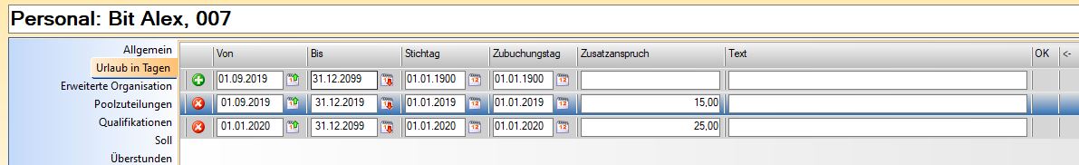 Ist der Grundanspruch von 25 Tagen bereits über die Anspruchsart oder eine Staffelung für Zusatzanspruch hinterlegt, muss in den bestehenden Urlaubszeilen keine Änderung vorgenommen werden!