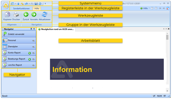 Mit Hilfe des Navigators können die verschiedenen Navigatorpunkte angesprochen werden. Nach dem Öffnen von Alex® ist der Navigator immer sichtbar. Abhängig von der Bildschirmgröße kann dieser unterschiedlich für die Anzeige eingestellt werden. Er ist entweder