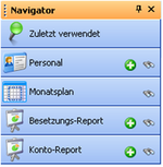 Der Navigator ist ständig am linken Bildschirmrand angezeigt. Abhängig von der eingestellten Ansicht sind die verschiedenen Navigatorpunkte (Zuletzt verwendet, Personal, Monatsplan, ...) sichtbar. In der Navigatortitelleiste ist die fixierte Stecknadel dargestellt