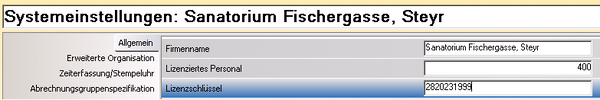 Der Lizenzschlüssel muss in den Systemeinstellungen in der Parametergruppe "Allgemein" erfasst oder auch geändert werden (bei Nachlizenzierung).