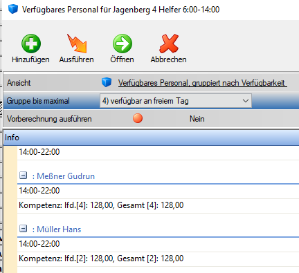 Im Dialog "verfügbarer Personal" können pro Mitarbeiter die bereits geleisteten Stunden pro Qualifikation und Qualifikationsstufe angezeigt werden.