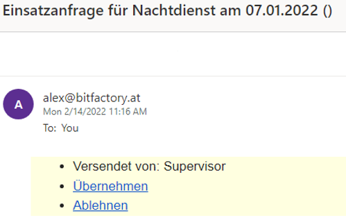 - Der Mitarbeiter erhält eine Nachricht und kann entscheiden, ob der Dienst übernommen wird oder nicht: die Möglichkeit der Zu- oder Absage kann direkt aus der E-Mail erfolgen - es erfolgt die entsprechende Antwort an den Dienstplaner per E-Mail.
