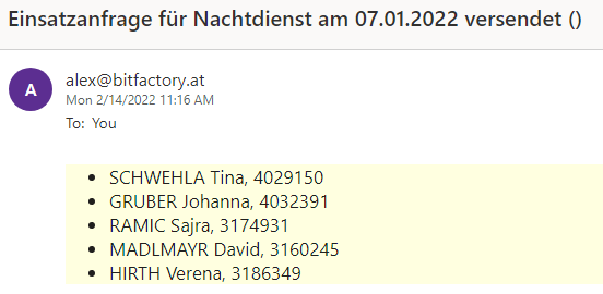 - -> die gewählten Mitarbeiter sowie der ausführende Benutzer bekommen eine E-Mail