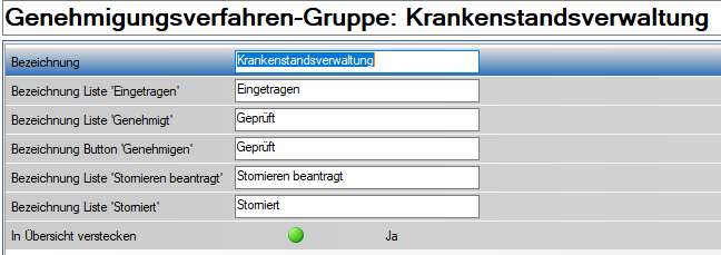 Weiters kann mit dem Parameter "In Übersicht verstecken" bestimmt werden ob die Anträge dieser Genehmigungsverfahren-Gruppe weiterhin in der Gesamtübersicht aller Genehmigungsverfahren angezeigt wird oder nicht.