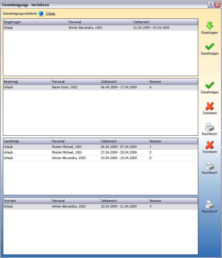 • Urlaub nach Genehmigung stornieren - zB wenn der Urlaub genehmigt wurde, der Mitarbeiter jedoch plötzlich erkrankte (es wird hier ein Stornoschein gedruckt und der Urlaub erhält eine neue lfd. Nummer)