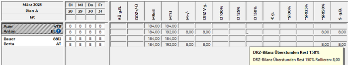 Der im obigen Beispiel angezeigte Tool-Tip zeigt die erfolgte Umbuchung bei der Mitarbeiterin Bauer: es wurden bei ihr 8 Stunden vom D 150% rolliert und somit ins *SR150% übertragen.