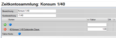 Für die Berechnung des Konsums bentötigt man eine Zeitkontosammlung. In dieser Zeitkontosammlung muss der Planungscode für den 1/40 Konsum mit dem Faktor 1 hinterlegt sein.