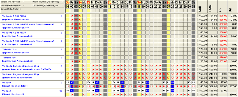 Grundsätzlich nur mit einer Sollstundenberechnung nach Tagessoll mit regelmäßiger Verteilung in der 5-Tage-Woche möglich. Und hier auch nur dann, wenn die Abwesenheit nicht an Samstagen, Sonn- und Feiertagen eingetragen wird (Vergleich Beispiel 7 und Beispiel 8). Mit allen übrigen Sollstundenberechnungen führt sie zu einem Ungleichgewicht in der Monatsabrechnung. Da es sich aber um eine Spezialform der Abwesenheitsberechnung handelt, ist nicht damit zu rechnen, dass ein Mitarbeiter mit einer Abwesenheit mit dieser Berechnungsmethode den gesamten Monat ausfällt.