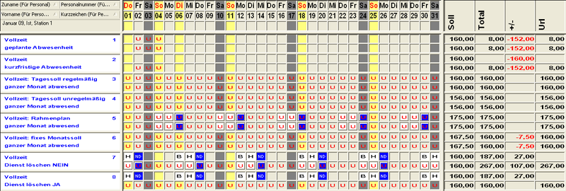 Es wird im Soll- und auch im Istdienstplan die Tagessollstellung des Mitarbeiters als Abwesenheitsstunde angenommen. Aus diesem Grund ist sie nur in Verbindung mit einer Sollstundenberechnung aus Tagessollstunden zu empfehlen. Bei der Sollstundenberechnung nach fixem Monatssoll führt sie unweigerlich zu Mehr- oder Minderleistungen. Die Sollstundenberechnung nach einem Rahmenplan ist dahingehend abgesichert, dass sich die Abwesenheitsstunden immer aus dem dahinterliegenden Dienst errechnen.