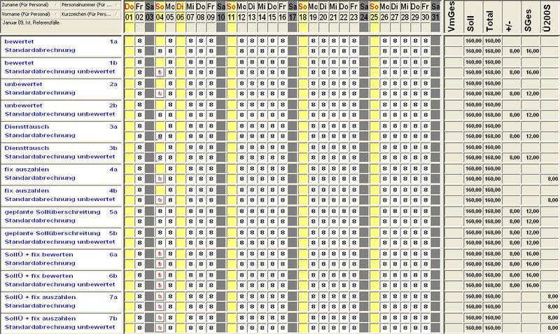 Bei allen Beispielen handelt es sich um eine Vollzeitkraft mit einer Wochenstundenverpflichtung von 40 Stunden pro Woche. Es wurde immer ein Dienst am ersten Sonntag im Monat eingetragen um den Unterschied zwischen Standardabrechnung und Standardabrechnung unbewertet zu verdeutlichen. Wenn für den Sonntagsdienst die tatsächliche Tageswertigkeit gewünscht wird, handelt es sich dabei um die Wertigkeit 1:2,0. Alle sonstigen Mehrleistungen (geplante Sollüberschreitung, unbewertete Mehrleistungen und Diensttausch) erhalten die Wertigkeit 1:1,5, wenn sie das Monatssoll der Vollzeitkraft überschreiten.