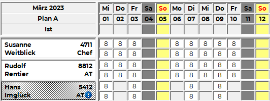 Für den 7.3.2023 ist hier bei Herrn Imglück ersichtlich, dass für die Zeitstrecken 8:00 - 12:00 sowie 13:00 - 17:00 das Abrechnungsschema "Arbeitszeit Dienste(Tag) Standard" herangezogen wird: