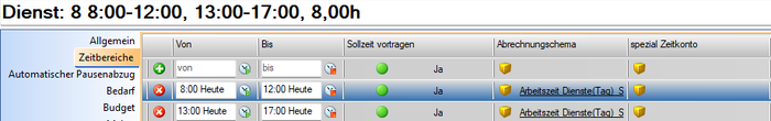 Beim Dienst wurde das Abrechnungsschema "Arbeitszeit Dienste(Tag) Standard" hinterlegt: