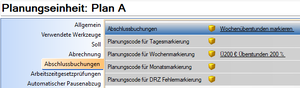werden Wochenfehler-Stunden mit dem, am Personal abgegriffenen, vererbt setzbaren, "Planungscode für Wochenüberstunden", ab Sonntag 24:00 eingetragen. | Ist "Tages/Wochenfehler für komplette Woche" ="NEIN" wird in der letzten Woche nur ab Ultimo 24:00 markiert. [2] | |||||
