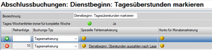 Die Spezielle Fehlermarkierung wird auf jeden Tag angewendet. Dabei wird geprüft, ob es an diesem Tag einen Fehler gibt, den die Fehlermarkierung beheben kann. Trifft dies zu wird die Fehlermarkierung angewendet. | Alle Tagesüberstunden am Tagesbeginn markieren, kann mit Tagesfehlermarkierung umgesetzt werden. | ||||||