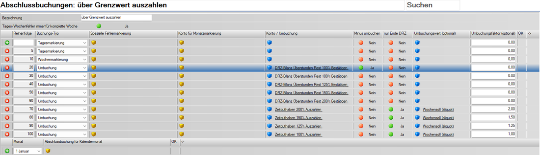 • nur Ende DRZ: Wenn hier JA ausgewählt wird, dann wird diese Umbuchung nur am DRZ-Ende durchgeführt. Notwendig, wenn man z. B. Zeitguthaben (Salden) anspricht in den Umbuchungen, sonst würden diese Umbuchungen jedes Monats ausgeführt werden.